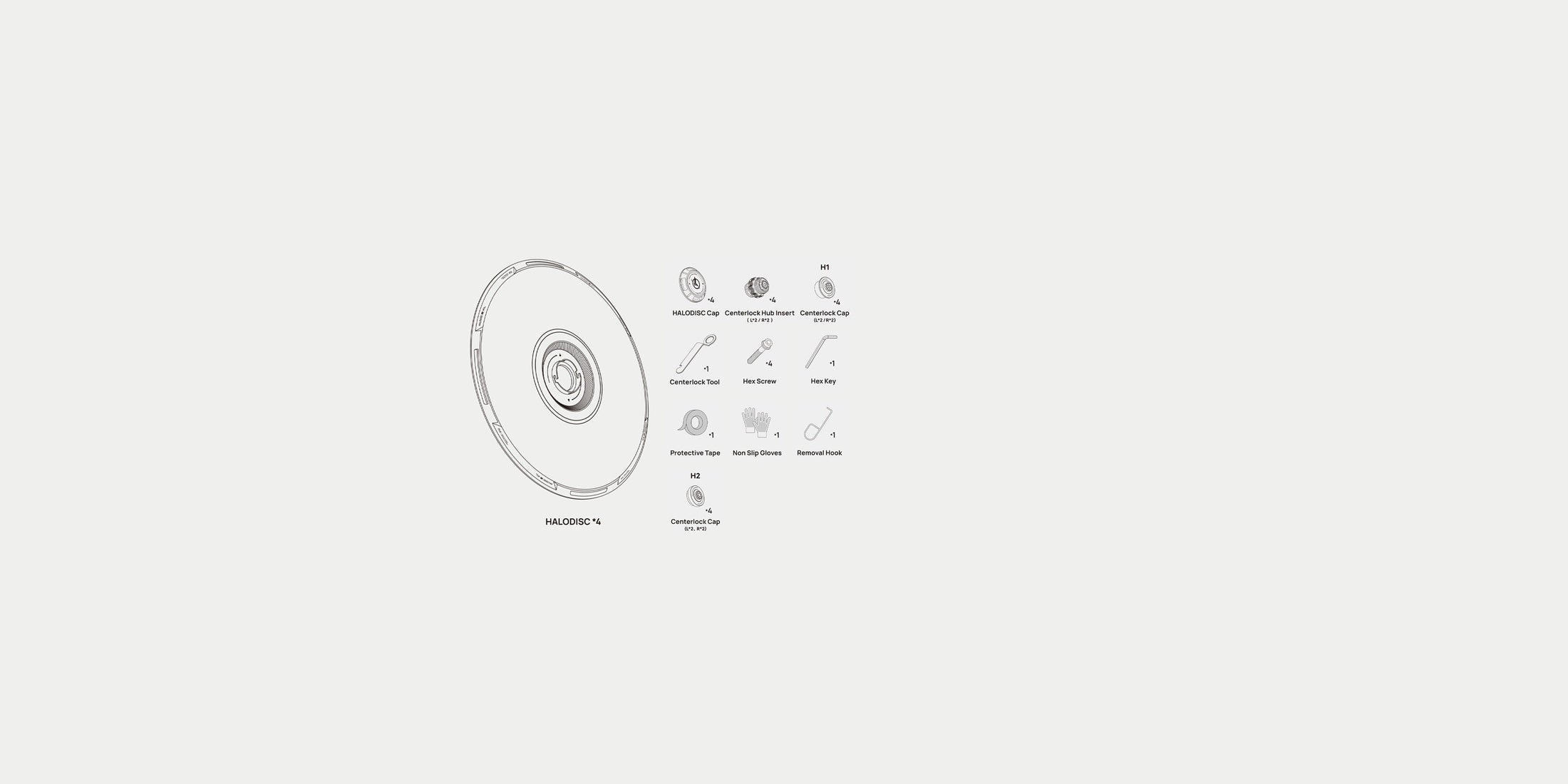 HALODISC *41/4 Inch Hex Key * 1Removal Hook * 1Non-Slip Gloves * 1 PairHALODISC Cap * 4Centerlock Hub Insert * 4Centerlock Cap * 4Centerlock Tool * 1Protective Tape *1